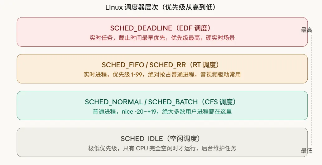实时进程(SCHED_FIFO/SCHED_RR)只要存在,就会抢占所有普通进程,nice 值对它们没有意义。音视频驱动、工业控制等对延迟敏感的场景会用到实时调度。