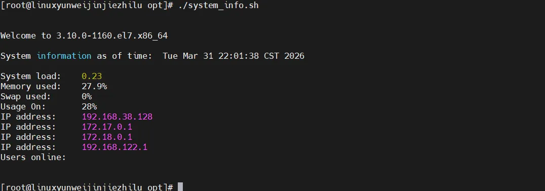 # 脚本1cp system_info.sh /etc/profile.d/chmod +x /etc/profile.d/system_info.sh# 脚本2cp system_info1.sh /etc/profile.d/chmod +x /etc/profile.d/system_info1.sh下次登录,信息自动展示,无需手动执行。