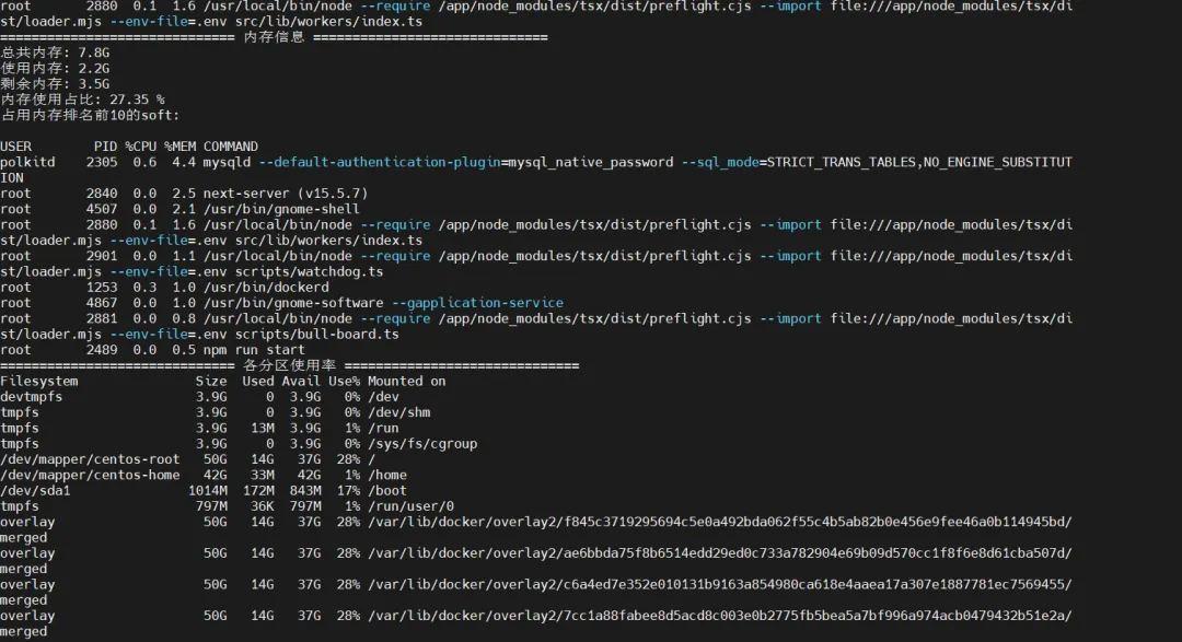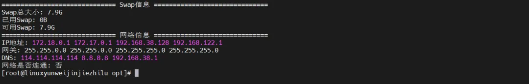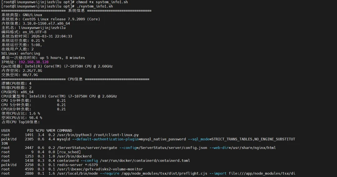 #!/bin/bashclearLogFileName=polling.$(date +%F-%T) EchoFormat=$(for (( i=0;i<30;i++ ));doecho -n "=";done)# 系统信息SystemInfo(){printf"${EchoFormat} 系统信息 ${EchoFormat}\n"printf"系统类型: %-10s\n" $(uname -a| awk '{print $NF}') printf"系统版本: %-10s\n""$(cat /etc/redhat-release)"printf"内核信息: %-10s\n" $(uname -r) printf"主机名: %-10s\n" $(uname -n)printf"编码格式: %-10s\n"${LANG}printf"系统当前时间: %-10s %-10s\n" $(date +%F) $(date +%T) printf"系统运行负载: %-4s %-1s\n" $(uptime | awk -F: '{print $5 }'|awk -F, '{print $1,"%"}') printf"系统运行天数: %-10s\n" $(uptime |awk '{print $3}') printf"在线用户人数: %-3s\n" $(w|tail -n +3|wc -l)printf"SELinux: %-10s\n" $(grep "SELINUX=[d|e|p]" /etc/selinux/config |awk -F= '{print $2}') echo -e "最后一次修改时间: $(uptime -p)"echo -e "IP地址: $(hostname -I | cut -d' ' -f1)"echo -e "Cpu处理器: $(lscpu | grep "Model name:" | sed 's/Model name:\s*//')"echo -e "内存空间: $(free -h | awk '/^Mem:/ { print $3 "/" $2 }')"echo -e "交换空间: $(free -h | awk '/^Swap:/ { print $3 "/" $2 }')"}# CPU信息CpuInfo(){ MemonyId=$(top -b -n1|awk 'NR==3'|awk -F, '{print $4}'| cut -c 1-5) MemonyUse=$(echo"100-${MemonyId}" |bc)printf"${EchoFormat} CPU信息 ${EchoFormat}\n"printf"逻辑CPU核数: %-3s\n" $(grep "processor" /proc/cpuinfo|sort -u|wc -l)printf"物理CPU核数: %-3s\n" $(grep "physical id" /proc/cpuinfo |sort -u|wc -l) printf"CPU架构: %-3s\n" $(uname -m)printf"CPU设置型号: %-3s\n""$(grep "model name" /proc/cpuinfo |awk -F: '{print $2}'|sort -u|cut -c 2-50)"echo -e "CPU 1分钟负载: `awk '{printf "%15s",$1}' /proc/loadavg`"echo -e "CPU 5分钟负载: `awk '{printf "%15s",$2}' /proc/loadavg`"echo -e "CPU10分钟负载: `awk '{printf "%15s",$3}' /proc/loadavg`"printf"使用CPU占比: %-1s %-1s\n"${MemonyUse} %printf"空闲CPU占比: %-1s %-1s\n"${MemonyId} %printf"占用CPU Top10信息:\n\n" ps -eo user,pid,pcpu,pmem,args --sort=-pcpu |head -n 10}# Memory信息MemoryInfo(){printf"${EchoFormat} 内存信息 ${EchoFormat}\n"printf"总共内存: %-1s\n" $(free -mh|awk "NR==2"|awk '{print $2}') printf"使用内存: %-1s\n" $(free -mh|awk "NR==2"|awk '{print $3}') printf"剩余内存: %-1s\n" $(free -mh|awk "NR==2"|awk '{print $4}') printf"内存使用占比: %-1s %-1s\n" $(free | grep -i mem |awk '{print $6/$2*100}'|cut -c1-5) %printf"占用内存排名前10的soft:\n\n" ps -eo user,pid,pcpu,pmem,args --sort=-pmem |head -n 10}# 磁盘使用量排序:Disk_Info() {printf"${EchoFormat} 各分区使用率 ${EchoFormat}\n" df -hecho}# Swap信息SwapInfo(){printf"${EchoFormat} Swap信息 ${EchoFormat}\n"printf"Swap总大小: %-1s\n" $(free -mh|awk "NR==3"|awk '{print $2}') printf"已用Swap: %-1s\n" $(free -mh|awk "NR==3"|awk '{print $3}') printf"可用Swap: %-1s\n" $(free -mh|awk "NR==3"|awk '{print $4}')}# 网络信息NetworkInfo(){printf"${EchoFormat} 网络信息 ${EchoFormat}\n"printf"IP地址: %-1s %-1s %-1s %-1s\n" $(ifconfig -a|grep inet|grep -v 127.0.0.1|grep -v inet6|awk '{print $2}'|tr -d "addr:") printf"网关: %-1s %-1s %-1s %-1s\n" $(ifconfig -a|grep "netmask"|grep -v 127.0.0.1|awk '{print $4}') printf"DNS: %-1s %-1s %-1s %-1s %-1s\n" $(grep "nameserver" /etc/resolv.conf | awk '{print $2}')if (ping -c2 -w2 www.baidu.com &>/dev/null);thenprintf"网络是否连通: %s\n" 是 printf"公网IP地址: %s\n" $(curl -s ip.sb) elseprintf"网络是否连通: %s\n" 否fi}# docker检查DockerInfo(){printf"${EchoFormat} docker运行情况 ${EchoFormat}\n"printf"当前正在运行的容器:\n $(docker ps --format "{{.Names}}")\n"printf"当前没有运行的容器:\n $(docker ps --format "{{.Names}}"|grep Exited)\n"}#直接登录后打印SystemInfo CpuInfoMemoryInfoDisk_InfoSwapInfoNetworkInfo保存为 system_info1.sh,效果更强大: