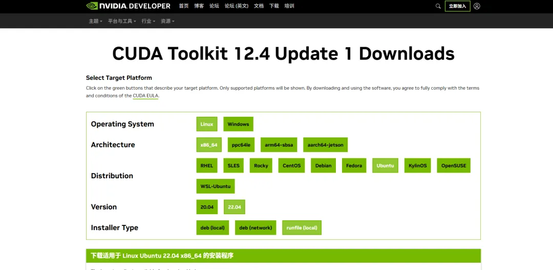 https://developer.nvidia.cn/cuda-downloads?target_os=Linux&target_arch=x86_64&Distribution=Ubuntu&target_version=22.04&target_type=runfile_local