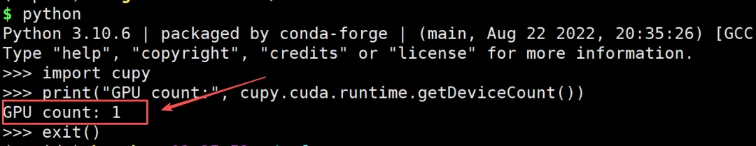 $ python>>> import cupy>>> print("GPU count:", cupy.cuda.runtime.getDeviceCount())GPU count: 1>>> exit()