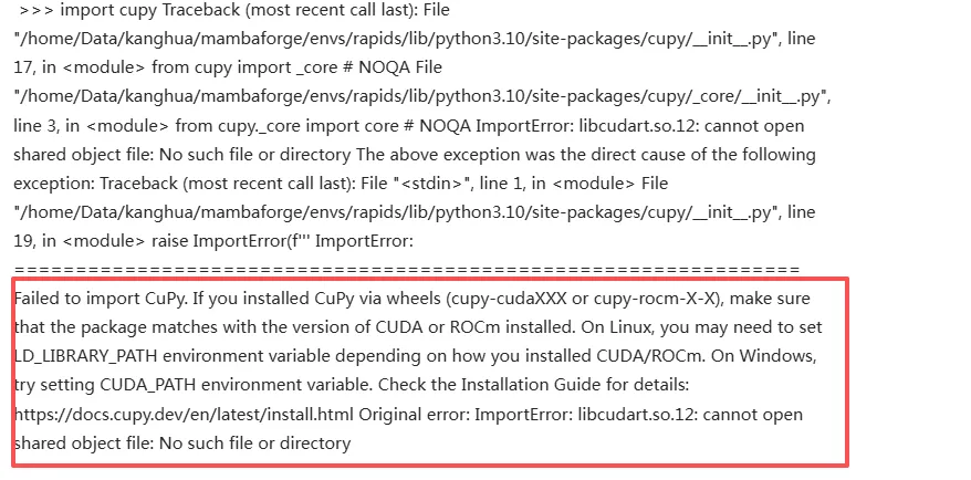 >>> import cupy Traceback (most recent call last): File "/home/Data/kanghua/mambaforge/envs/rapids/lib/python3.10/site-packages/cupy/__init__.py", line 17, in <module> from cupy import _core # NOQA File "/home/Data/kanghua/mambaforge/envs/rapids/lib/python3.10/site-packages/cupy/_core/__init__.py", line 3, in <module> from cupy._core import core # NOQA ImportError: libcudart.so.12: cannot open shared object file: No such file or directory The above exception was the direct cause of the following exception: Traceback (most recent call last): File "<stdin>", line 1, in <module> File "/home/Data/kanghua/mambaforge/envs/rapids/lib/python3.10/site-packages/cupy/__init__.py", line 19, in <module> raise ImportError(f''' ImportError: ================================================================ Failed to import CuPy. If you installed CuPy via wheels (cupy-cudaXXX or cupy-rocm-X-X), make sure that the package matches with the version of CUDA or ROCm installed. On Linux, you may need to set LD_LIBRARY_PATH environment variable depending on how you installed CUDA/ROCm. On Windows, try setting CUDA_PATH environment variable. Check the Installation Guide for details: https://docs.cupy.dev/en/latest/install. html Original error: ImportError: libcudart.so.12: cannot open shared object file: No such file or directory