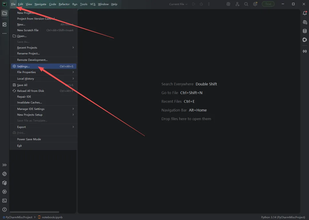 1.左上角三条杠,找到“File”,点击Settings(设置)