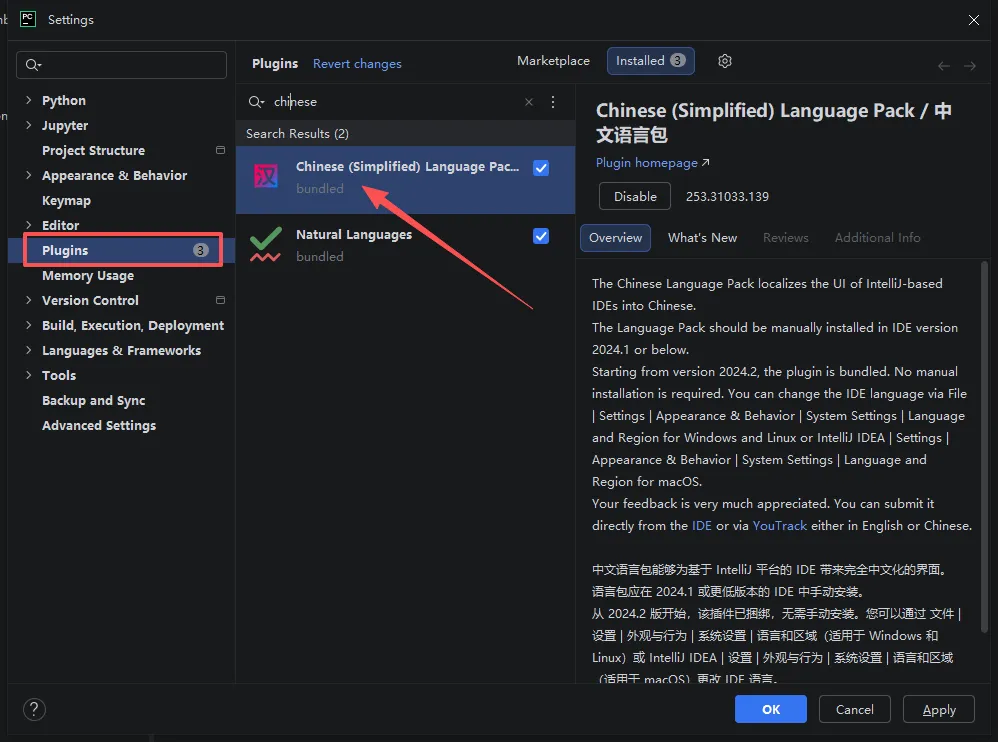 2.接着点击左侧 “Plugins”(插件),之后在中间搜索框中搜索"Chinese"