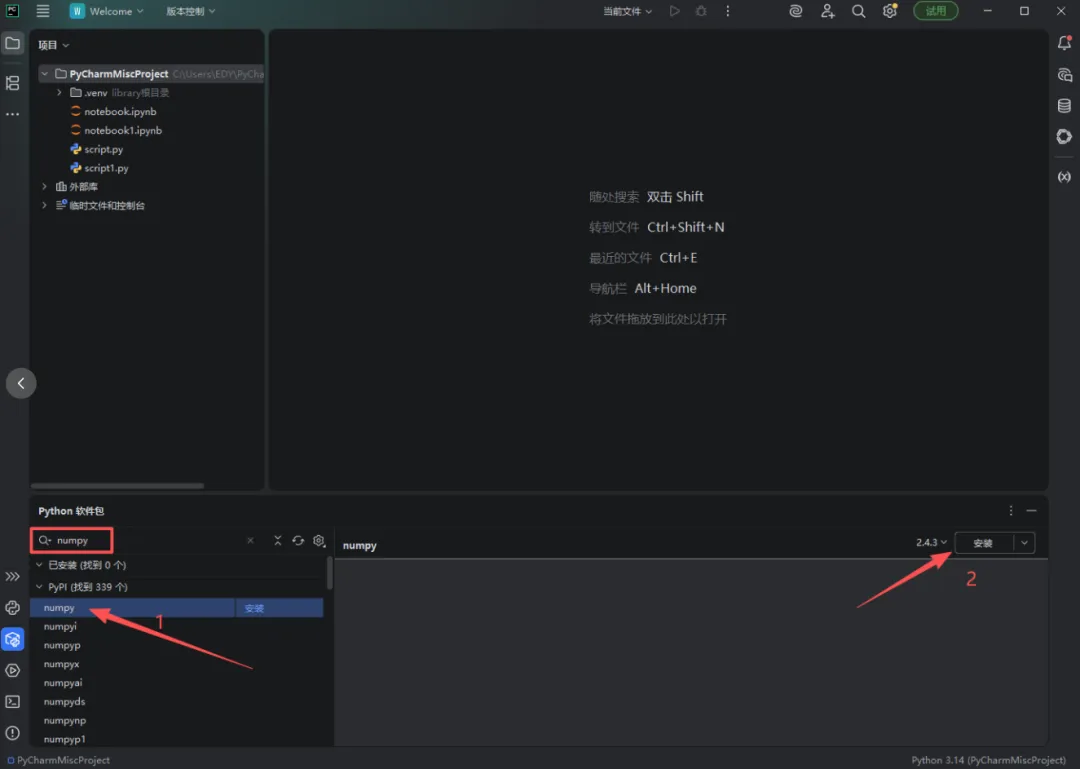 2.在搜索框输入要安装的的库名,以“Numpy”为例