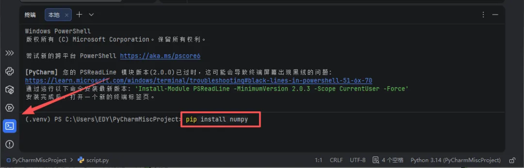 第二种方法:在pycharm的终端输入这串代码,按回车键即可