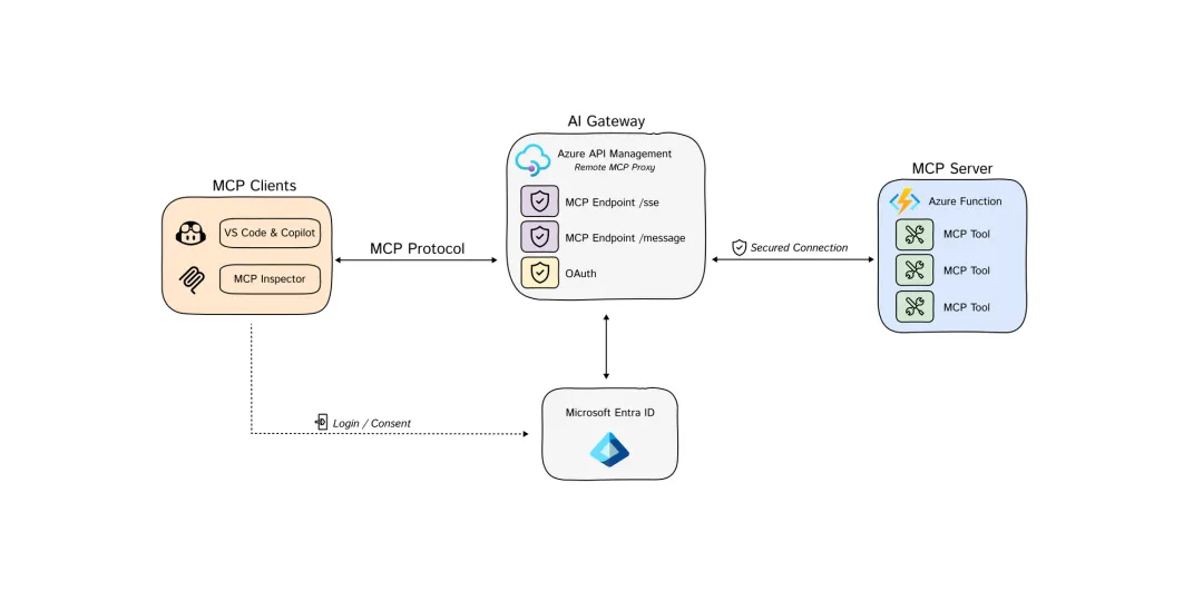 它利用Azure API Management作为网关,处理了最让人头疼的OAuth认证和权限管理,后端则是无服务器的Azure Functions。如果你在公司内部推MCP落地,需要过安全合规这一关,直接甩这个方案给架构师,能省去你无数的口舌。