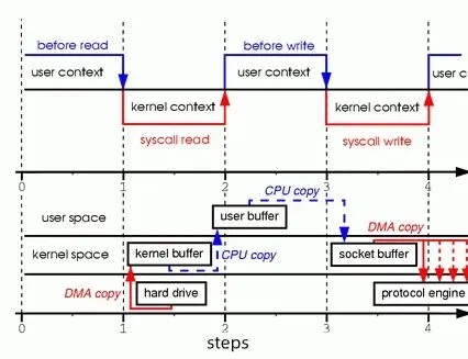 咱们先拿最常见的Web服务器传输静态文件举例,传统I/O的操作流程,说出来你可能都会觉得“绕”。当客户端请求一个静态图片时,数据得先从磁盘通过DMA拷贝到内核缓冲区,接着CPU还要手动把数据从内核缓冲区搬到用户缓冲区,然后用户程序再把数据从用户缓冲区拷回内核的socket缓冲区,最后才由DMA把数据从socket缓冲区送到网卡,发给客户端。这一套下来,光是数据拷贝就有4次,还得加上多次上下文切换,CPU全耗在“搬数据”上了,哪有精力处理真正的业务逻辑?高并发下能不卡吗?