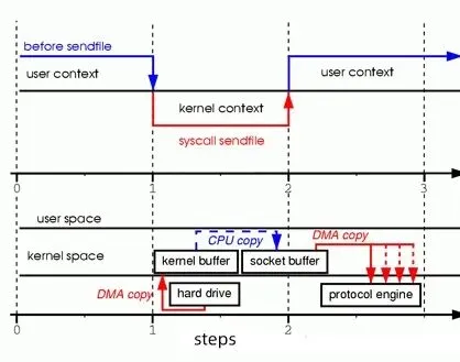 再看Kafka,咱们平时用它传输海量日志,要是用传统I/O,生产者发消息到Broker,Broker得先把数据从内核缓冲区拷到用户缓冲区,再拷回socket缓冲区才能发给消费者,不仅慢,还特别耗资源。而Kafka之所以快,就是因为用了零拷贝——结合Page Cache和sendfile系统调用,数据直接从内核缓存送到网卡,不经过用户空间,拷贝和切换次数直接减半,吞吐量自然就上去了。