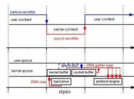 Linux 2.4 版本的内核对 sendfile 系统调用进行了改进,引入了 DMA gather 操作,进一步提升了零拷贝的性能,实现了真正意义上的 “零 CPU 拷贝”。在传统的 sendfile 实现中,虽然数据可以直接在内核空间从文件传输到 socket 缓冲区,但在内核缓冲区到 socket 缓冲区这一步,仍然需要 CPU 参与数据拷贝。而 DMA 聚集技术的出现,改变了这一现状。