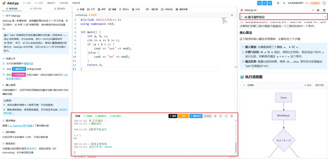 为了解决少儿学习 C++ 的这些痛点,专业的工具选择尤为重要。在这里,我们向正在规划 C++ 学习路径的家庭推荐 AdaCpp——一个专为信奥竞赛(GESP/CSP-J/S)打造的 AI 驱动在线学习平台。