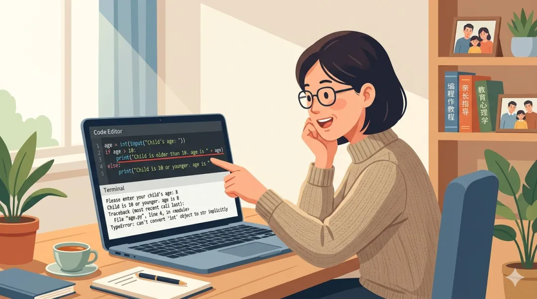 TypeError: can only concatenate str (not "int") to str`input()` 拿到的内容,默认会被当成"文字",print("明年你", age + 1, "岁")"咦?我看到的是数字,为什么电脑理解的不是数字?"很多孩子第一次冒出"是不是我不适合学编程",往往就是在这种看起来像数字、电脑却不认的时候。"编程里,同样看起来像一个东西,电脑可能会按另一种方式理解。"四、30分钟后我最大的感受:家长学编程,不是为了变成老师