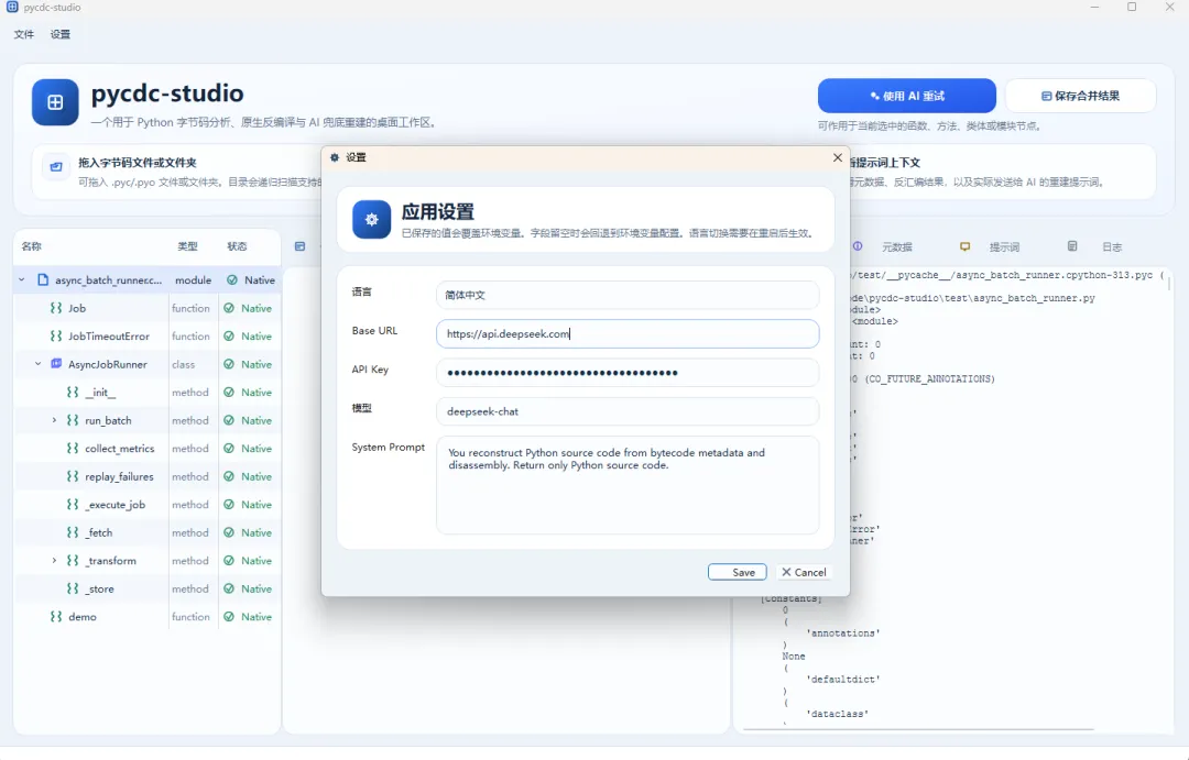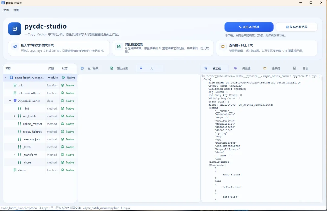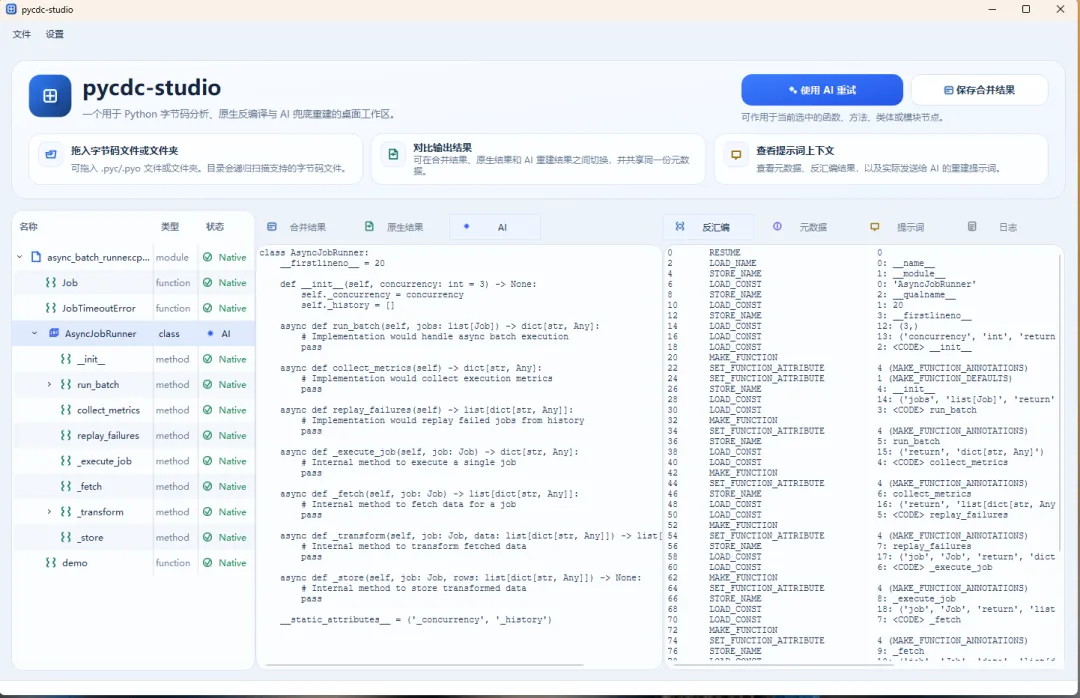 它是一个基于 Qt Widgets 的桌面应用,用来配合 pycdc / pycdas 做 Python 字节码分析、反编译结果查看,以及在原生反编译效果不理想的时候,提供 AI 辅助重建能力。
