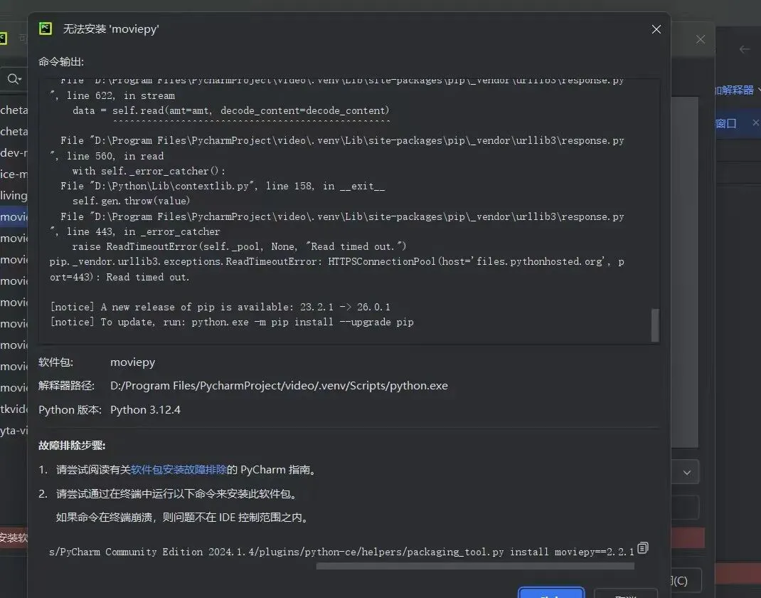 再次安装movipy时提示超时,至此还是没解决问题,其实和昨天是一样的问题。