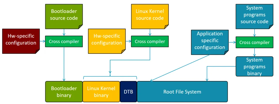 通用开源构建系统:Yocto和Buildroot,社区维护活跃、行业应用广泛,可从源码从头构建工具链、引导程序、内核和根文件系统。