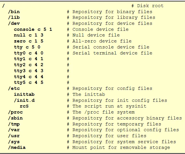 构建标准的Linux目录树,核心目录包括/bin(二进制可执行文件)、/lib(库文件)、/dev(设备文件)、/etc(配置文件)、/proc(内核进程文件系统)等,其中/dev需包含console、null、tty等基础设备文件;