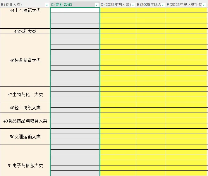 请根据教育部2025年最新专业目录,把这些专业映射到对应的大类,再按大类统计学生人数,并按指定格式填进报表,输出年初、年底和平均三个时间点的数据。