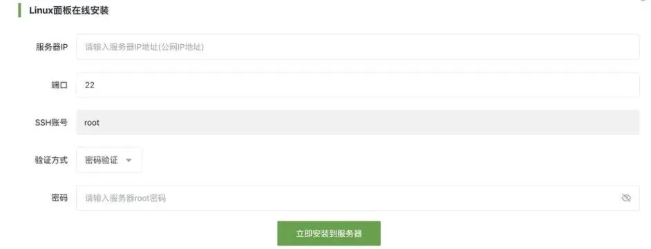 还有一种安装方式是通过ssh的链接,通过官网的ssh链接安装,我一般不推荐这种方式安装,因为不清楚是不是有ssh泄露的风险。填入服务器的IP、ssh端口号、密码,就可以自动化安装了。