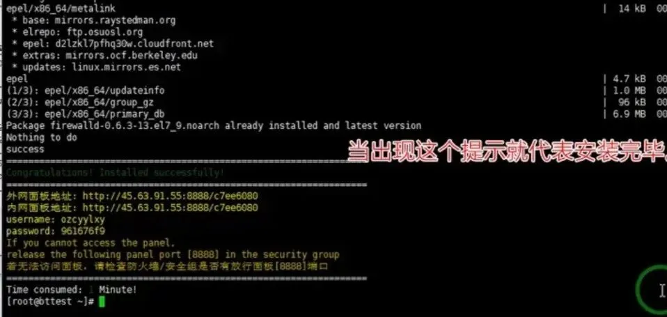 【关键时刻】:当命令跑完,停下来的时候,屏幕上会显示出 面板地址、username(用户名) 和 password(密码)。