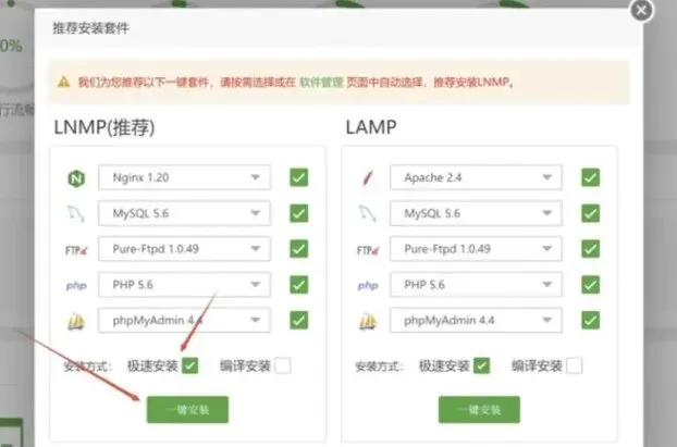 选择套件: 登录进去后,会弹出一个“推荐安装套件”的窗口。这里有两个选择:LNMP 和 LAMP。