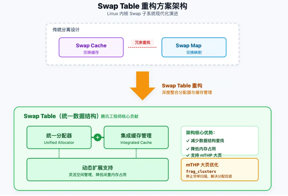 自2025年 Linux 存储、文件系统、内存管理与BPF峰会上首次亮相以来,腾讯服务器操作系统 TencentOS 内核研发工程师 KairuiSong 主导的Swap现代化工程,历经了多个阶段的演进:swap table 的引入(已合并进 Linux 6.18)从根本上替代了沿用多年的 XArray 结构,带来 5%~20%的性能提升;swap map 的移除(面向 Linux 7.1)进一步统一了 Swap 元数据管理,节省约 30% 的元数据内存开销;而将整个 Swap 子系统重新构建于更为清晰、高效的数据结构之上的宏大目标,正逐步从设想变为现实。