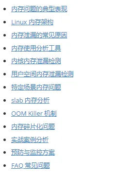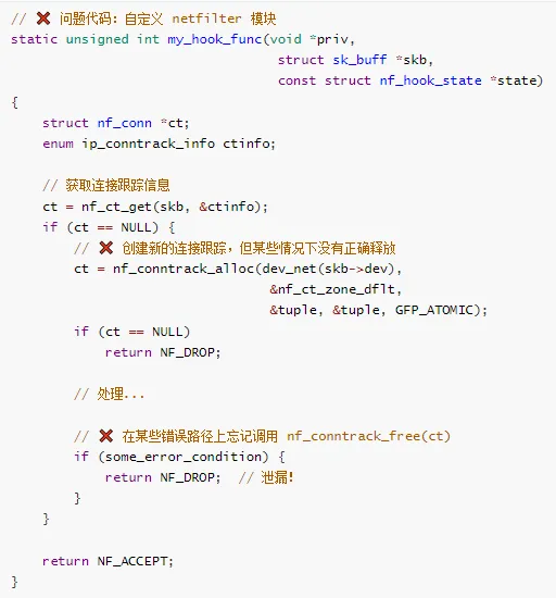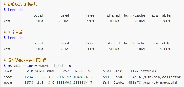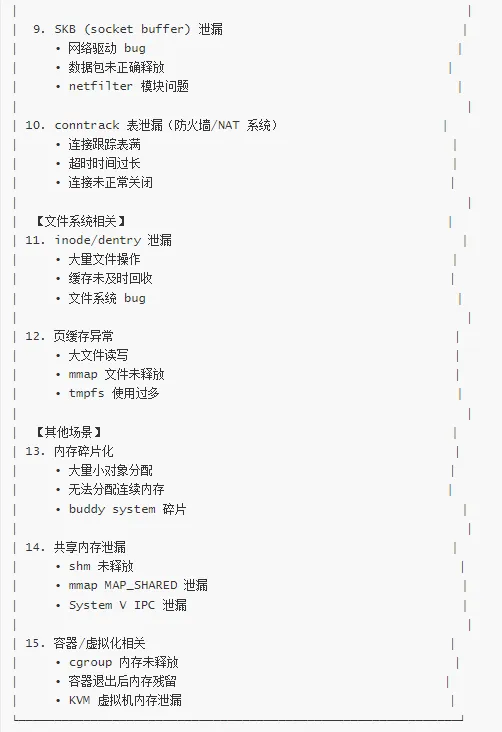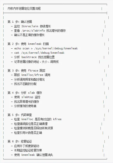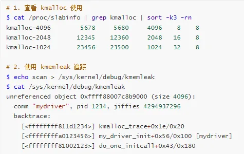 用户空间泄漏 → 使用 Valgrind、ASan、进程监控