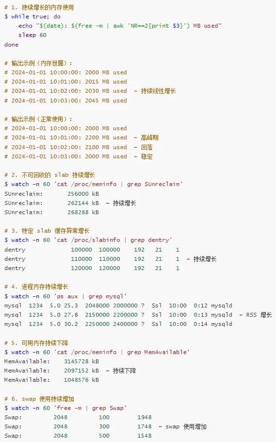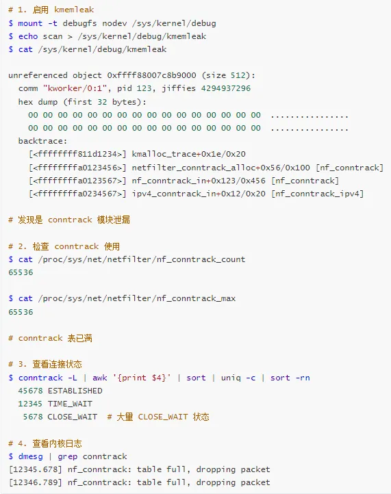 内核空间泄漏 → 使用 kmemleak、slab 分析