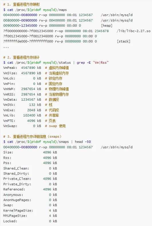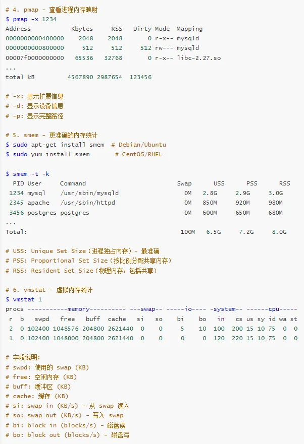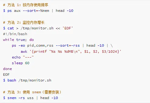 | 查看进程内存 | ps, smem | ps aux --sort=-%mem |
