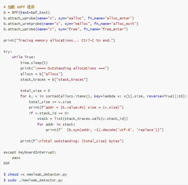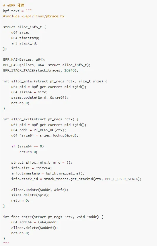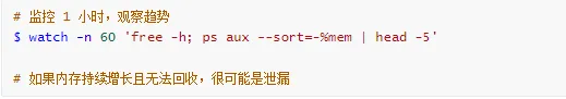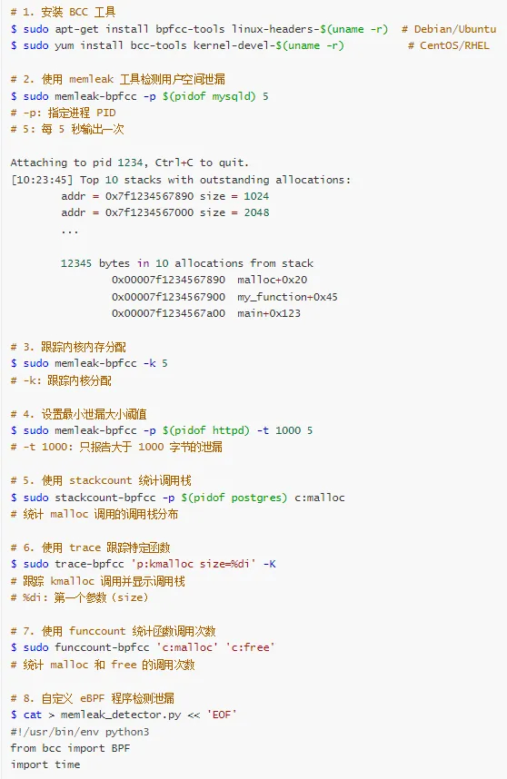 | 实时追踪 | eBPF/BCC | memleak -p <pid> |