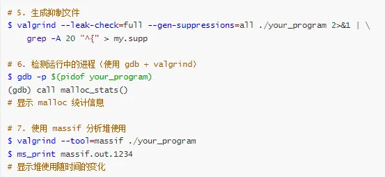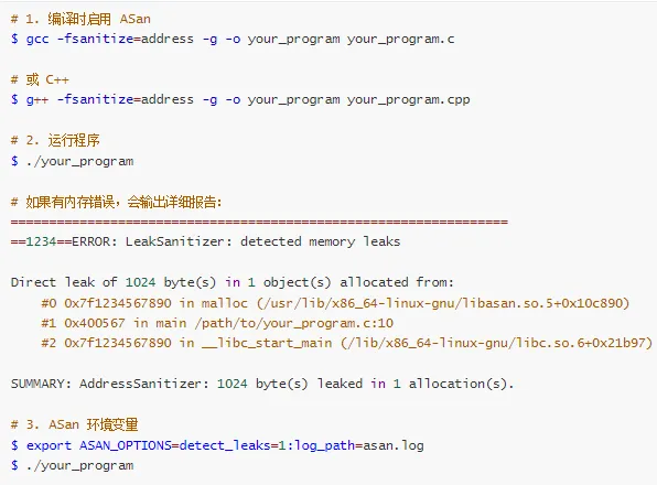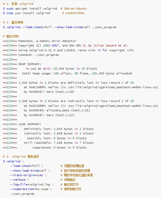 | 用户空间泄漏检测 | Valgrind | valgrind --leak-check=full ./app |