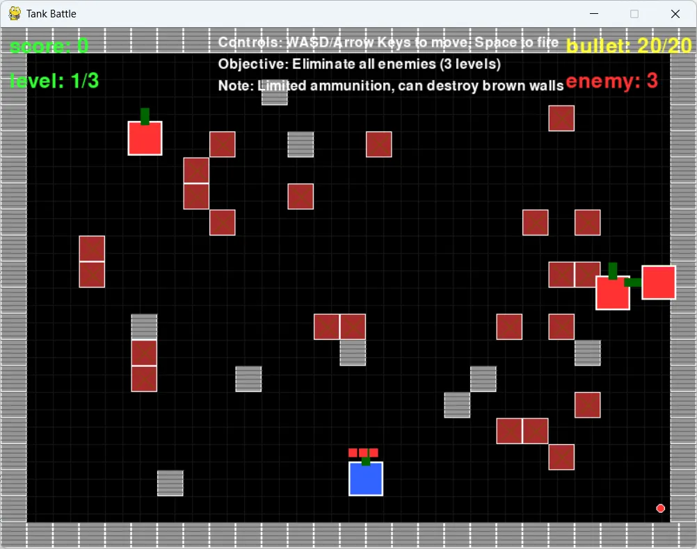 defmove(self,dx,dy,walls):#计算新位置new_x=self.x +dxnew_y=self.y +dy#创建坦克的矩形tank_rect= pygame.Rect(new_x,new_y,self.width,self.height)#检查是否与墙壁碰撞can_move=Trueforwallinwalls:iftank_rect.colliderect(wall.rect)andwall.destructible:can_move=Falsebreak#检查边界ifnew_x<0ornew_x+self.width > WIDTHornew_y<0ornew_y+self.height > HEIGHT:can_move=False#如果可移动,则更新位置ifcan_move:self.x =new_xself.y =new_y#更新方向ifdx>0:self.direction =1elifdx<0:self.direction =3elifdy>0:self.direction =2elifdy<0:self.direction =0defupdate(self,walls):returnifself.cooldown >0:self.cooldown -=1#敌人AIif notself.is_playerandself.alive:#简单AI:随机移动和开火move_choice= random.randint(0,30)self.move(-self.speed,0,walls)self.move(self.speed,0,walls)self.move(0, -self.speed,walls)self.move(0,self.speed,walls)#随机开火ifrandom.random() < ENEMY_FIRE_RATEandself.cooldown ==0:return Nonedeffire(self):return Noneself.cooldown = PLAYER_FIRE_RATEifself.is_playerelse30#根据坦克方向计算子弹起始位置ifself.direction ==0:#上bullet_x=self.x +self.width //2bullet_y=self.ydx,dy=0, -1elifself.direction ==1:#右bullet_x=self.x +self.widthbullet_y=self.y +self.height //2dx,dy=1,0elifself.direction ==2:#下bullet_x=self.x +self.width //2bullet_y=self.y +self.heightdx,dy=0,1else:#左bullet_x=self.xbullet_y=self.y +self.height //2dx,dy= -1,0returnBullet(bullet_x,bullet_y,dx,dy,self.is_player)self.health -=1ifself.health <=0:self.alive =Falsereturn Truereturn Falsedefdraw(self,surface):return#绘制坦克主体tank_rect= pygame.Rect(self.x,self.y,self.width,self.height)pygame.draw.rect(surface,self.color,tank_rect)pygame.draw.rect(surface, WHITE,tank_rect,2)#绘制坦克炮管ifself.direction ==0:#上pygame.draw.rect(surface, DARK_GREEN,(self.x +self.width //2-5,self.y -15,10,20))elifself.direction ==1:#右pygame.draw.rect(surface, DARK_GREEN,(self.x +self.width,self.y +self.height //2-5,20,10))elifself.direction ==2:#下pygame.draw.rect(surface, DARK_GREEN,(self.x +self.width //2-5,self.y +self.height,10,20))else:#左pygame.draw.rect(surface, DARK_GREEN,(self.x -20,self.y +self.height //2-5,20,10))#绘制生命值(仅对玩家)ifself.is_player:foriinrange(self.health):pygame.draw.rect(surface, RED,(self.x +i*12,self.y -15,10,10))def__init__(self,x,y,dx,dy,is_player):self.x =xself.y =yself.dx =dxself.dy =dyself.radius =5self.speed = BULLET_SPEEDself.is_player =is_playerself.color = YELLOWifis_playerelseREDself.alive =Truedefupdate(self):self.x +=self.dx *self.speedself.y +=self.dy *self.speed#检查是否出界if(self.x <0orself.x > WIDTHorself.y <0orself.y > HEIGHT):self.alive =Falsedefdraw(self,surface):pygame.draw.circle(surface,self.color, (int(self.x),int(self.y)),self.radius)pygame.draw.circle(surface, WHITE, (int(self.x),int(self.y)),self.radius,1)returnpygame.Rect(self.x -self.radius,self.y -self.radius,self.radius *2,self.radius *2)def__init__(self,x,y,destructible=True):self.x =xself.y =yself.destructible =destructibleself.color = BROWNifdestructibleelseGRAYself.rect = pygame.Rect(x,y, WALL_SIZE, WALL_SIZE)self.alive =Truedefdraw(self,surface):pygame.draw.rect(surface,self.color,self.rect)pygame.draw.rect(surface, WHITE,self.rect,1)#添加纹理ifself.destructible:pygame.draw.line(surface, (139,69,19),(self.x + WALL_SIZE -5,self.y + WALL_SIZE -5),2)pygame.draw.line(surface, (139,69,19),(self.x + WALL_SIZE -5,self.y +5),(self.x +5,self.y + WALL_SIZE -5),2)#不可破坏的墙壁有网格纹理foriinrange(0, WALL_SIZE,5):pygame.draw.line(surface, (100,100,100),(self.x + WALL_SIZE,self.y +i),1)self.player = Tank(WIDTH //2, HEIGHT -100, BLUE,True)self.score =0self.level =1self.ammo = MAX_AMMOself.game_over =Falseself.game_won =Falseself.enemy_respawn_timer =0self.generate_walls()#创建边界墙forxinrange(0, WIDTH, WALL_SIZE):self.walls.append(Wall(x,0,False))self.walls.append(Wall(x, HEIGHT - WALL_SIZE,False))foryinrange(WALL_SIZE, HEIGHT - WALL_SIZE, WALL_SIZE):self.walls.append(Wall(0,y,False))self.walls.append(Wall(WIDTH - WALL_SIZE,y,False))#创建随机可破坏墙壁for_inrange(30):x= random.randint(3, (WIDTH // WALL_SIZE) -4) * WALL_SIZEy= random.randint(3, (HEIGHT // WALL_SIZE) -4) * WALL_SIZE#确保不在玩家起始位置周围生成墙if(abs(x-self.player.x) >100orabs(y-self.player.y) >100):self.walls.append(Wall(x,y,True))#创建一些不可破坏的障碍物for_inrange(10):x= random.randint(2, (WIDTH // WALL_SIZE) -3) * WALL_SIZEy= random.randint(2, (HEIGHT // WALL_SIZE) -3) * WALL_SIZEif(abs(x-self.player.x) >100orabs(y-self.player.y) >100):self.walls.append(Wall(x,y,False))defspawn_enemies(self,count):x= random.randint(50, WIDTH -50)y= random.randint(50, HEIGHT //2)#确保敌人不与玩家太近if(abs(x-self.player.x) >200orabs(y-self.player.y) >200):breakself.enemies.append(Tank(x,y, RED))foreventinpygame.event.get():ifevent.type == pygame.QUIT:return Falseifevent.type == pygame.KEYDOWN:ifevent.key == pygame.K_ESCAPE:return Falseifself.game_overorself.game_won:ifevent.key == pygame.K_r:self.__init__()#重置游戏elifevent.key == pygame.K_SPACEandself.ammo >0:bullet=self.player.fire()self.bullets.append(bullet)self.ammo -=1if notself.game_overand notself.game_won:keys= pygame.key.get_pressed()dx,dy=0,0ifkeys[pygame.K_LEFT]orkeys[pygame.K_a]:ifkeys[pygame.K_RIGHT]orkeys[pygame.K_d]:ifkeys[pygame.K_UP]orkeys[pygame.K_w]:ifkeys[pygame.K_DOWN]orkeys[pygame.K_s]:#对角线移动速度修正ifdx!=0anddy!=0:dx*=0.7071dy*=0.7071self.player.move(dx,dy,self.walls)return Truedefupdate(self):ifself.game_overorself.game_won:return#更新玩家self.player.update(self.walls)#更新敌人forenemyinself.enemies[:]:bullet=enemy.update(self.walls)self.bullets.append(bullet)#更新子弹forbulletinself.bullets[:]:#检查子弹是否击中墙壁forwallinself.walls[:]:ifwall.aliveandbullet.get_rect().colliderect(wall.rect):bullet.alive =Falseifwall.destructible:wall.alive =Falseself.walls.remove(wall)break#检查子弹是否击中玩家if notbullet.is