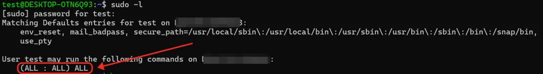 # 允许普通用户 test 只能用sudo执行 perl 命令,其他任何命令都禁止!test ALL=(ALL) /usr/bin/perl此时你尝试直接拿 root,会直接被拒绝: