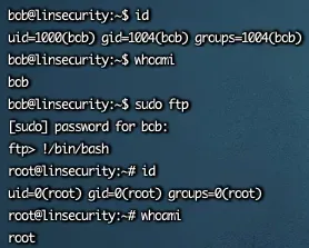 sudo ftp步骤2:在 ftp 交互界面输入!/bin/bash,回车跳转到 root shell。