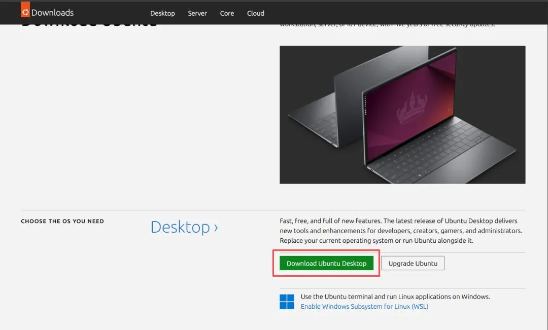 打开浏览器,访问 https://ubuntu.com/download,选择 Ubuntu Desktop 版本。