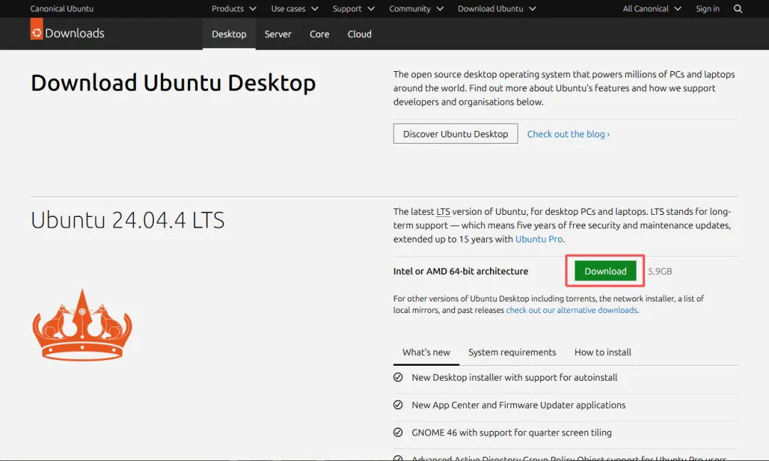 点击下载按钮,获取最新的 LTS(长期支持版)ISO 文件。LTS 版本稳定且支持时间长,适合初学者。