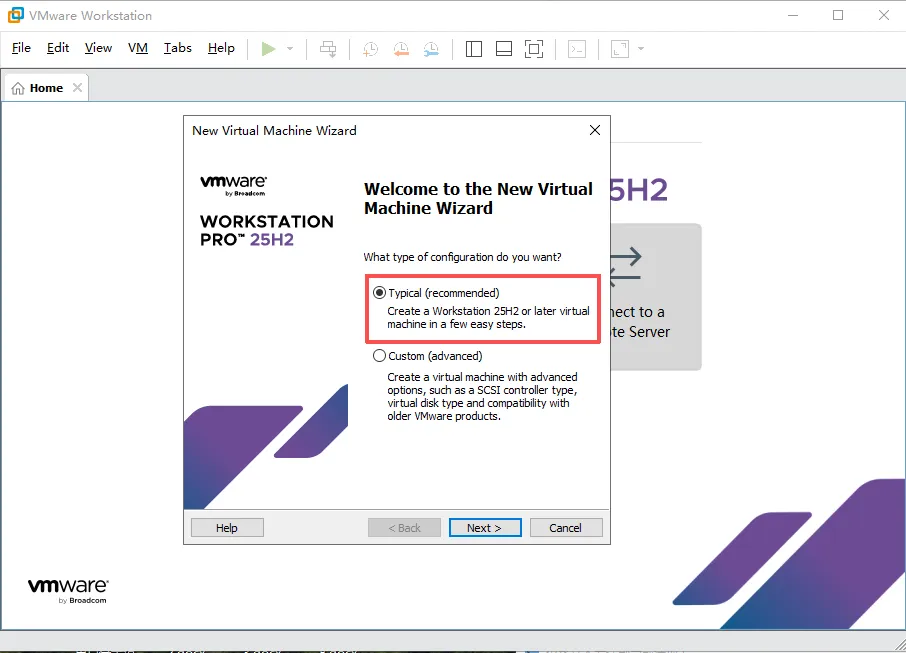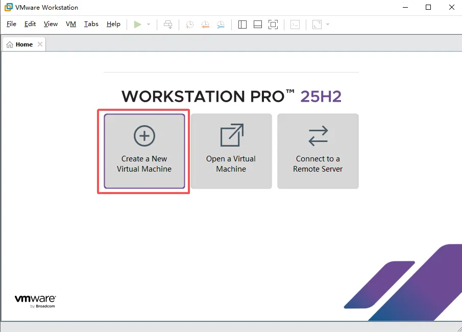 启动 VMware Workstation,点击 “创建新虚拟机”(Create a New Virtual Machine)。