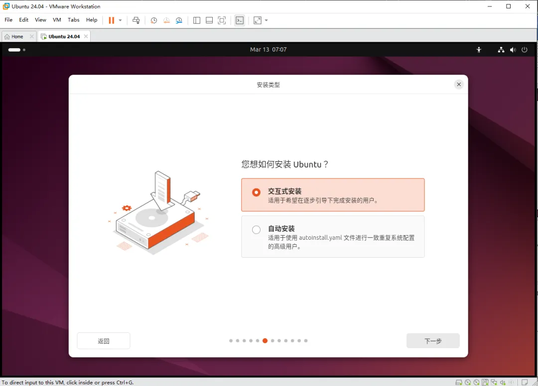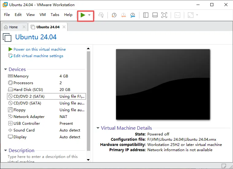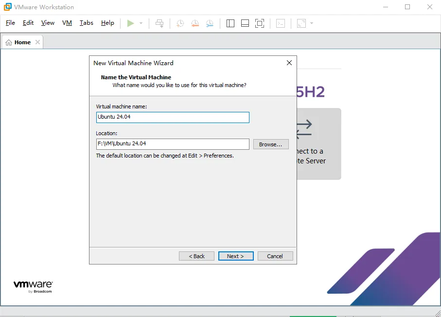 给虚拟机起个名字(如 “Ubuntu 24.04”),并选择安装位置(建议放在空间较大的磁盘,比如 D 盘)。