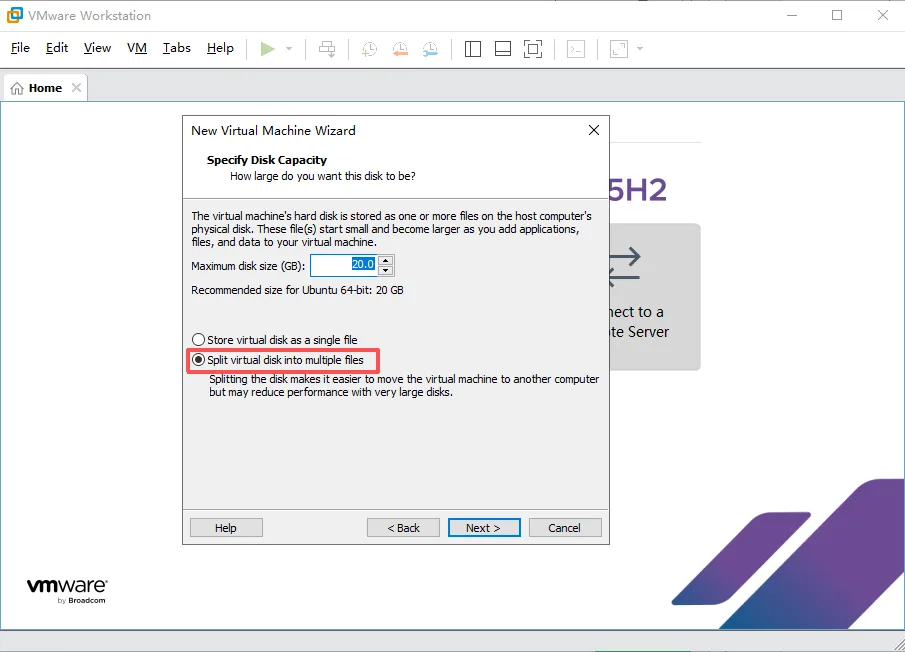 默认是 20GB,通常够用。你可以根据自己需要调整(建议 30-40GB)。选择 “将虚拟磁盘拆分为多个文件”(便于移动和备份)。