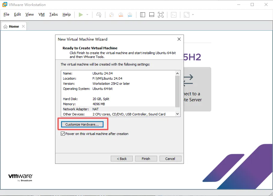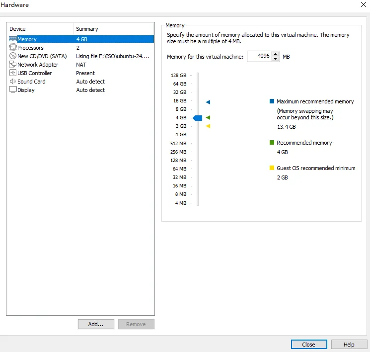 点击 “自定义硬件”,可以调整内存、处理器等。如果你电脑配置不错,可以给虚拟机分配更多内存(如 4GB)和 CPU 核心。网络适配器默认 NAT 模式即可(虚拟机通过宿主机上网)。