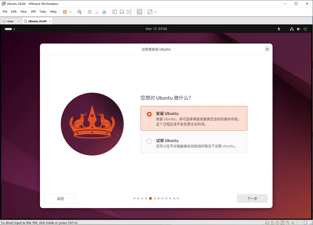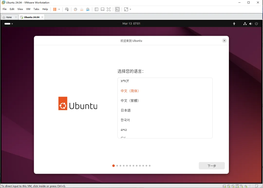 启动后会进入 Ubuntu 欢迎界面,左侧选择 中文(简体),然后点击 “下一步”。