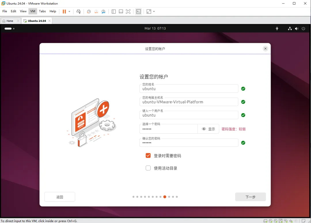 设置Ubuntu的用户名和密码,根据自身需求设置即可。点击“下一步”。