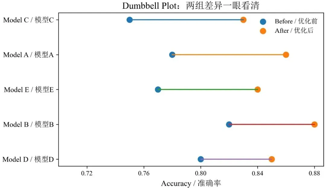 import osimport numpy as npimport matplotlib as mplimport matplotlib.pyplot as pltfrom matplotlib import font_manager as fmfrom matplotlib.ticker import MaxNLocator, FormatStrFormatter# == 字体设置 ==win_fonts = r"C:\Windows\Fonts"for p in [ os.path.join(win_fonts, "times.ttf"), os.path.join(win_fonts, "timesbd.ttf"), os.path.join(win_fonts, "timesi.ttf"), os.path.join(win_fonts, "simsun.ttc"),]: if os.path.exists(p): try: fm.fontManager.addfont(p) except Exception: passmpl.rcParams["font.family"] = ["Times New Roman", "SimSun"]mpl.rcParams["axes.unicode_minus"] = FalseOUT_DIR = r"D:\py_figs "os.makedirs(OUT_DIR, exist_ok=True)# == 示例数据 ==labels = [ "Model A / 模型A", "Model B / 模型B", "Model C / 模型C", "Model D / 模型D", "Model E / 模型E"]before = np.array([0.78, 0.82, 0.75, 0.80, 0.77])after = np.array([0.86, 0.88, 0.83, 0.85, 0.84])# == 按差值排序 ==diff = after - beforeorder = np.argsort(diff)[::-1]labels_s = [labels[i] for i in order]before_s = before[order]after_s = after[order]fig, ax = plt.subplots(figsize=(7.2, 4.2))y = np.arange(len(labels_s))# 连接线for yi, b, a in zip(y, before_s, after_s): ax.plot([b, a], [yi, yi], linewidth=1.5)# 两端点ax.scatter(before_s, y, s=70, label="Before / 优化前")ax.scatter(after_s, y, s=70, label="After / 优化后")ax.set_yticks(y)ax.set_yticklabels(labels_s, fontsize=11)ax.set_xlabel("Accuracy / 准确率", fontsize=12)ax.set_title("Dumbbell Plot:两组差异一眼看清", fontsize=14)ax.invert_yaxis()ax.set_xlim(left=0.7)ax.xaxis.set_major_locator(MaxNLocator(nbins=6))ax.xaxis.set_major_formatter(FormatStrFormatter("%.2f"))ax.legend(frameon=False)out_path = os.path.join(OUT_DIR, "dumbbell_plot_basic.jpg")fig.savefig(out_path, dpi=300, bbox_inches="tight", pad_inches=0.05)plt.close(fig)print("Saved:", out_path)