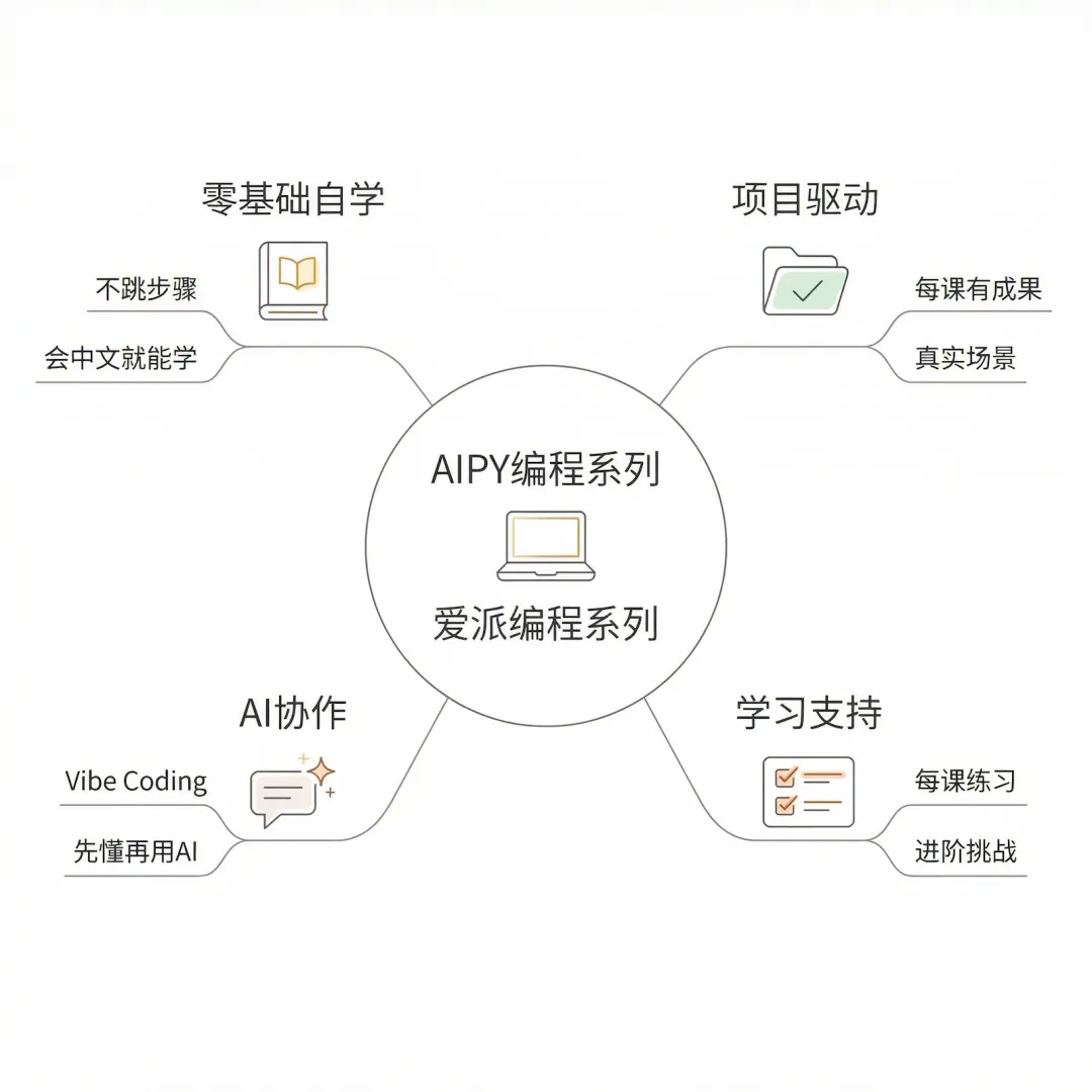 当然,它也要与 AI 时代同步。课程会教 Vibe Coding——用自然语言和 AI 协作编程。但在此之前,你必须理解变量是什么、循环是什么、函数是什么。先学会自己写,再学会让 AI 帮你写;知道什么时候该用 AI,什么时候不该用;理解 AI 生成的代码,而不是盲目复制。