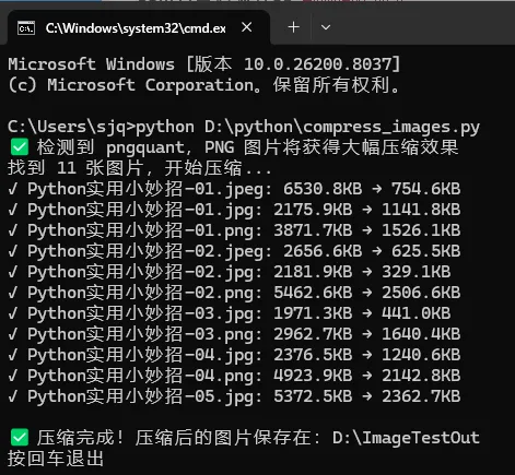 original_size = os.path.getsize(input_path) / 1024new_size = os.path.getsize(output_path) / 1024print(f"✓ {file}: {original_size:.1f}KB → {new_size:.1f}KB")os.path.getsize获取文件大小(字节),除以1024转成KB,直观对比压缩效果。打开cmd(Win+R,输入cmd,回车),执行如下命令: