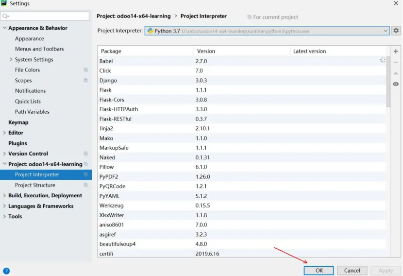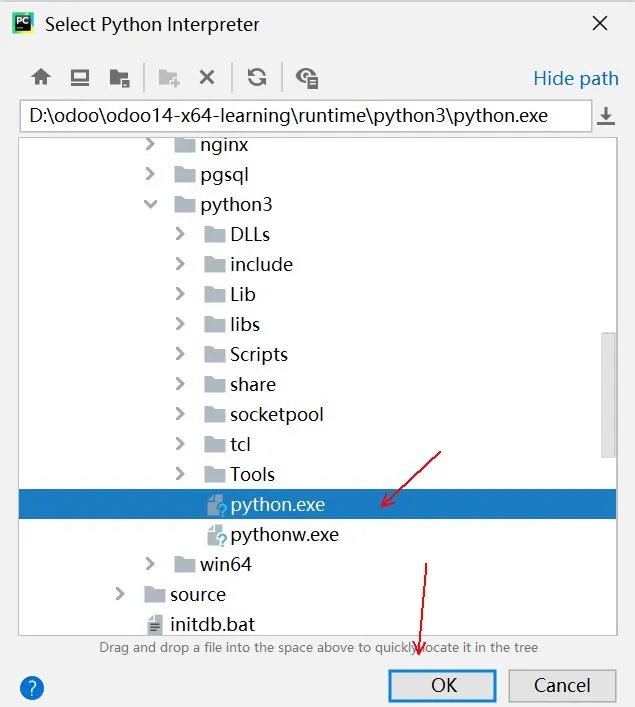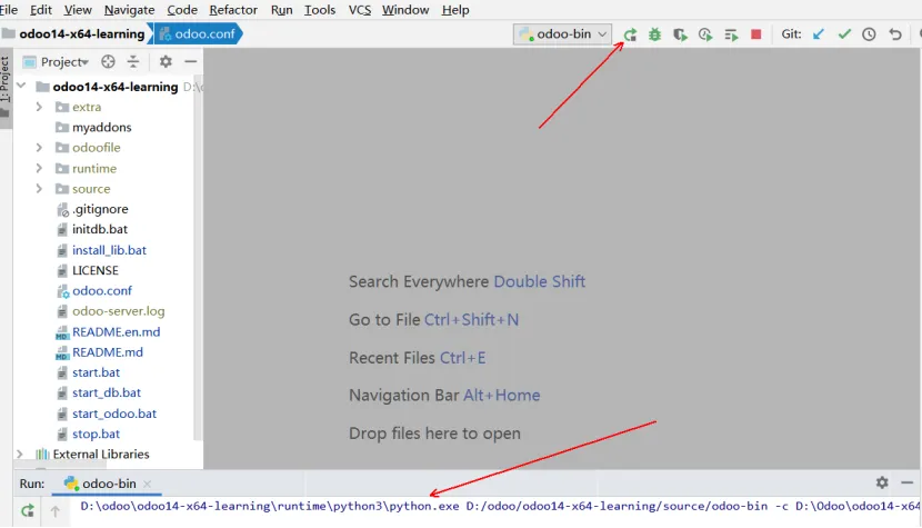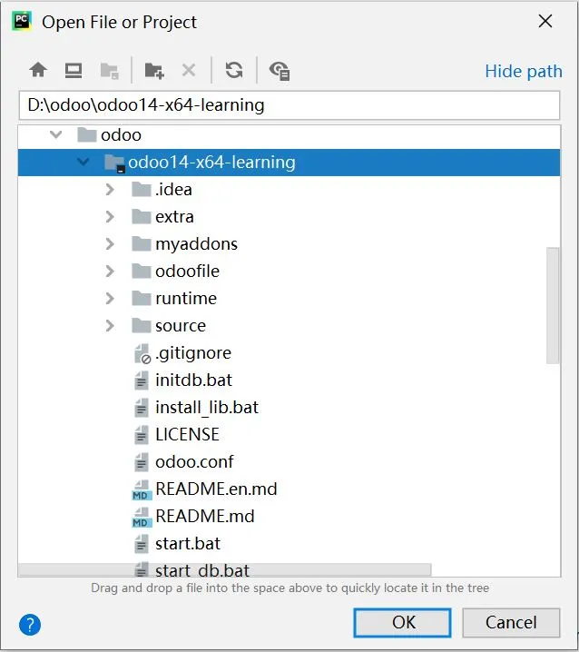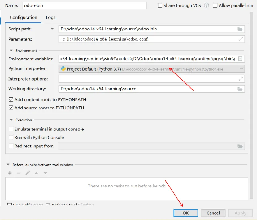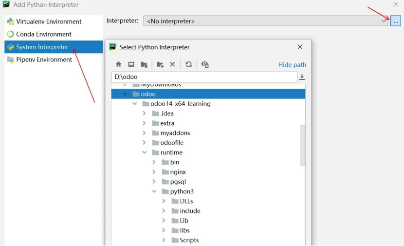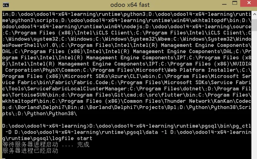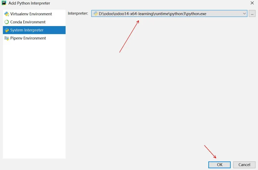 在PyCharm启动后,点击Open打开ODOO项目选择窗口,定位到ODOO14绿色版位置。编辑或配置PyCharm参数。如果有odoo-bin配置文件则点击obdd-bin的下拉列表,点击Edit Configurations...。如果没有,点击add Configuration...,点击加号,点击Python,name输入obdd-bin,然后参数同下:Script Path:项目启动文件,一般会自动获取。或选择source\odoo-bin。Parameters:配置参数,改成正确的路径,-c D:\Odoo\odoo14-x64-learning\odoo.conf,具体可以看启动文件是用的哪个配置文件,有可能是bin下的odoo.conf文件。Environment Variables:环境变量,点击右侧的小图标可进入设置,建议在桌面上新建一个文本文件,将path重新编辑,因为在这个输入框里编辑起来很不方便,其内容如下:d:\Odoo\odoo14-x64-learning\runtime\win64\wkhtmltopdf;d:\Odoo\odoo14-x64-learning\runtime\win64\nodejs;D:\odoo\odoo14-x64-learning\runtime\pgsql\bin;D:\odoo\odoo14-x64-learning\runtime\python3;D:\odoo\odoo14-x64-learning\runtime\win32\libsass;设置Pycharm里面Python interperter的Python编译器。File菜单,选择Settings。选择Project:项目名称下的Project interpreter,点击Project Interpreter右侧的齿轮。设置完Python运行环境,继续设置运行环境,点击Run菜单,再点击Edit Configurations设置。我们在Python interpreter下拉列表选择刚才设置的编译环境,再点击OK按钮,结束设置。现在开始测试odoo是否正常,后期开发也同样操作,先点击ODOO14绿色版下的start_db.bat,运行odoo需要的数据库。再点击PyCharm上的运行按钮,开始运行odoo。首次启动ODOO,Windows安全中心会提示是否允许访问,点击允许访问。稍定片刻后,我们打开火狐或谷歌浏览器,在地址栏输入127.0.0.1:8069,出现以下界面,表示odoo已经启动了,127.0.0.1表示是本机IP,8069是ODOO端口号,至此ODOO绿色版已经准备好了。