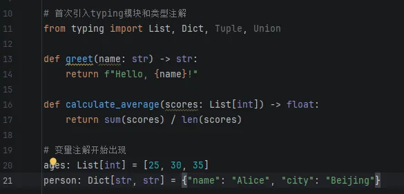 今天学习了python的类型注解,应该说没有它程序也能跑通。但对于一个系统工程来说,要考虑程序的美观、易用以及可扩展性多方面。一个没有类型注解的程序别说让人接手会很麻烦,即便自己时间长了也不知道变量是什么类型了,会花费大量时间解读程序。所以说类型注解是python的一大进步。
